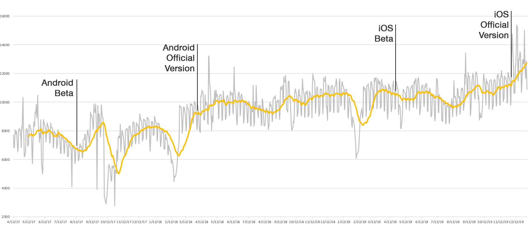 After the Android beta launch and official launch, The number of the average daily active users increased by 25%+. iOS beta launch and official launch brought another 25%+ increase. In general, daily active users grew from 8000+ to 12000+ and it is still growing.